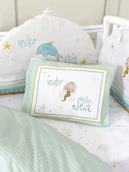 Η πάντα κούνιας sea love είναι ιδανική για να χαρίσετε στο μωράκι σας την απόλυτη προστασία και ένα ταξίδι στον μαγικό κόσμο του βυθού της θάλασσας. Διαθέτει ένα παιχνιδιάρικο σχέδιο με χαριτωμένα δελφίνια που κολυμπούν, μέδουσες που χορεύουν, κοχύλια και αστερίες, που προσδίδει μια αίσθηση υποβρύχιας περιπέτειας και χαράς. Τα απαλά χρώματα, όπως το γαλάζιο, το τιρκουάζ και το κίτρινο, δημιουργούν ένα γλυκό και χαλαρωτικό αποτέλεσμα. Έχει περίτεχνο σχήμα και δημιουργεί ένα όμορφο παιχνίδισμα με τα ημικυκλικά σχήματά της. Συνδυάστε την με το ασορτί κουβερλί και σετ σεντονάκια και προσφέρετε στο μωράκι σας την απόλυτη ασφάλεια και τρυφερότητα που απαιτείται για την ισορροπημένη ανάπτυξή του.
