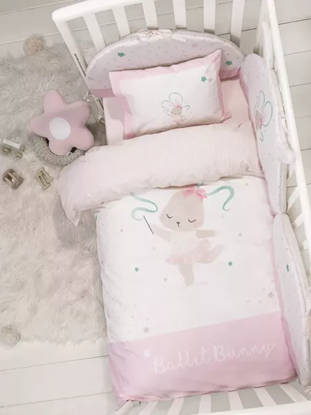 Τα βαμβακερά βρεφικά σεντόνια ballet bunny έχουν ένα όμορφο πάνελ σχέδιο με μια γλυκιά λαγουδίνα μπαλαρίνα, πλαισιωμένη από αστεράκια και καρδιές. Οι απαλές αποχρώσεις του ροζ και του λευκού δημιουργούν μια ατμόσφαιρα ηρεμίας και τρυφερότητας, ενώ τα μονόχρωμα τμήματα με τις λεξούλες "ballet bunny" προσθέτουν μια παιχνιδιάρικη πινελιά. Μια υπέροχη πάνελ μαξιλαροθήκη απογειώνει την εικόνα του στρωμένου κρεβατιού. Μετατρέψτε τo δωμάτιο της μικρής σας σε ένα μαγικό χαρούμενο χώρο με τα προϊόντα κρεβατιού ballet bunny, που περιλαμβάνουν την πάντα το κουβερλί και την κουβερτούλα ballet bunny! Θα απολαύσετε το αποτέλεσμα και εσείς μαζί με το μωράκι σας!