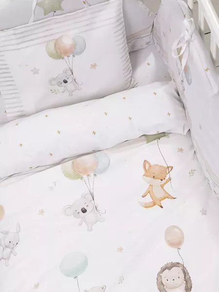 Τα βαμβακερά βρεφικά σεντόνια jouer είναι σχεδιασμένα με αγάπη και φροντίδα για το μωράκι σας. Το σχέδιό του ζωντανεύει με χαριτωμένα ζωάκια του δάσους – αλεπουδίτσες, ρακούν, κοάλα και σκαντζοχοιράκια, που πετούν με πολύχρωμα μπαλόνια. Τα διακριτικά αστεράκια και τα απαλά χρώματα τους, δημιουργούν μια γαλήνια και παιχνιδιάρικη ατμόσφαιρα, ιδανική για να κοιμάται και να ονειρεύεται το μωρό σας. Η υπέροχη πάνελ μαξιλαροθήκη του σχεδίου είναι μια έξτρα παιχνιδιάρικη πινελιά που απογειώνει την εικόνα του. Δημιουργήστε ένα χαρούμενο "καταφύγιο" για της ώρες ανάπαυσης του μωρού σας, πλουτίζοντας το στρώσιμο της κούνιας του με την ασορτί πάντα και κουβερλί, ή και την βελουτέ κουβερτούλα jouer.
