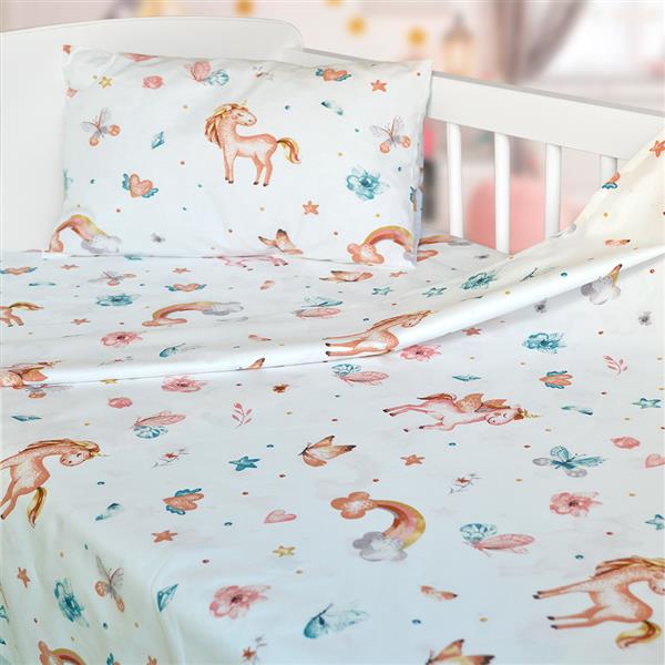 Σετ σεντόνια Magic Horse Pink από τη νέα βρεφική συλλογή της εταιρείας Lino Home. Το σετ Magic Horse έχει πάνω του χαριτωμένα λουλουδάκια και ουράνια τόξα σε ξεχωριστούς χρωματικούς συνδυασμούς. Η νέα bebe συλλογή της εταιρείας Lino Home, είναι διακοσμημένη με τα πιο όμορφα σχέδια βγαλμένα από όνειρο. Απαλά χρώματα, κομψά σχέδια και η ασύγκριτη ποιότητα της εταιρείας Lino Home, συνδυάζονται για να χαρίσουν στο μωρό σας μοναδικές στιγμές ξεκούρασης στο βρεφικό κρεβατάκι. Τα τεμάχια που απαρτίζουν το σετ είναι κατασκευασμένα από 100% απαλό βαμβακερό ύφασμα και ανεξίτηλα χρώματα προκειμένου να διασφαλίσουν έναν υγιεινό ύπνο στο μωρό σας. Το σετ αποτελείται από ένα πανωσέντονο και ένα κατωσέντονο διάστασης 120Χ170 και μία μαξιλαροθήκη 30Χ40. Προτείνεται πλύσιμο στους 40oC και σιδέρωμα σε μέτριες θερμοκρασίες. Απαγορεύεται η χρήση χλωρίου ή λευκαντικού.