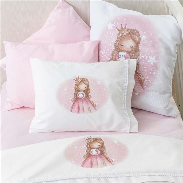 Σετ σεντόνια κούνιας με μαξιλαροθήκη από ύφασμα μερσεριζέ, 160 κλωστών, 100% βαμβακερό, μονόχρωμο, σε χρώμα λευκό, με διακοσμητική δαντέλα και ψηφιακή εκτύπωση στο πανωσέντονο και στη μαξιλαροθήκη, σχέδιο πριγκίπισσα.