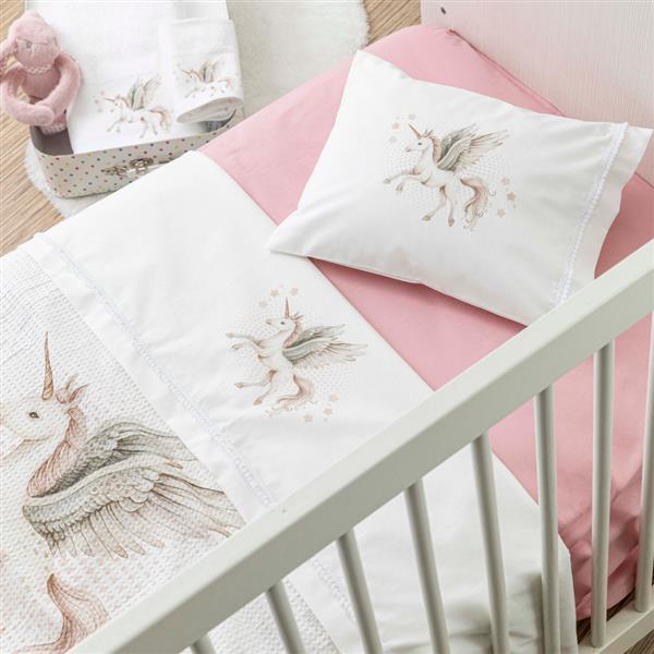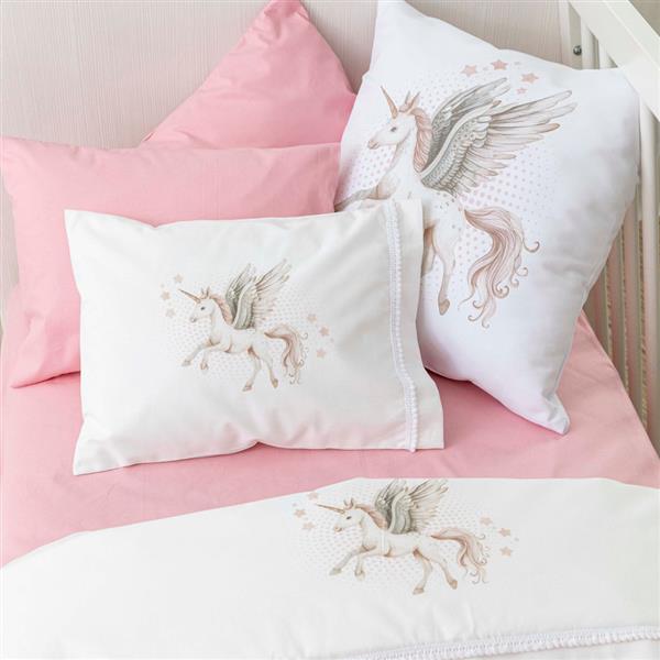 Σετ σεντόνια κούνιας με μαξιλαροθήκη από ύφασμα μερσεριζέ, 160 κλωστών, 100% βαμβακερό, μονόχρωμο, σε χρώμα λευκό, με διακοσμητική δαντέλα και ψηφιακή εκτύπωση στο πανωσέντονο και στη μαξιλαροθήκη, σχέδιο μονόκερος.