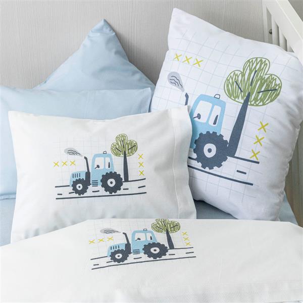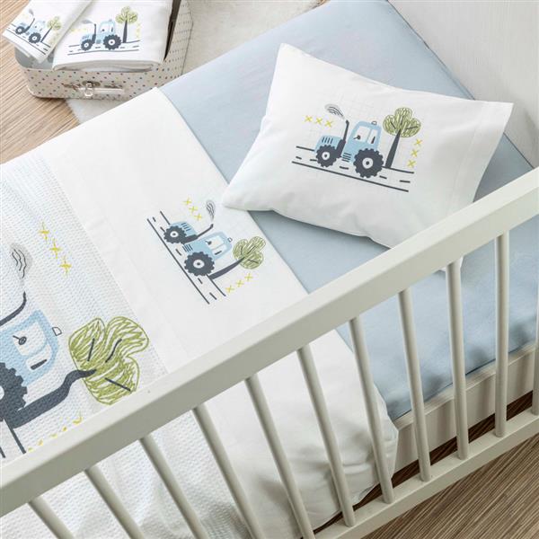 Σετ σεντόνια κούνιας με μαξιλαροθήκη από ύφασμα μερσεριζέ, 160 κλωστών, 100% βαμβακερό, μονόχρωμο, σε χρώμα λευκό, με ψηφιακή εκτύπωση στο πανωσέντονο και στη μαξιλαροθήκη, σχέδιο τρακτέρ.