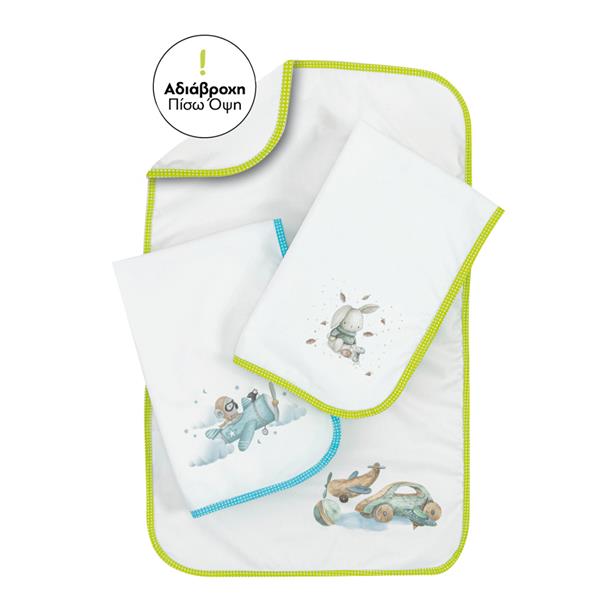 Σελτέ αγκαλιάς από ύφασμα PVC με αδιάβροχη προστασία στην πίσω όψη και φροτέ 100% βαμβακερό στην άνω όψη, λευκό με χρωματιστό ρέλι περιμετρικά και ψηφιακή εκτύπωση για αγόρι.