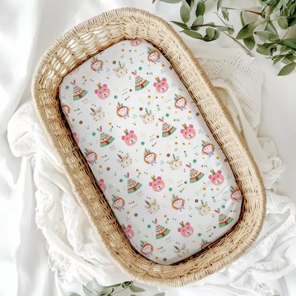 Σετ 2 σεντόνια λίκνου (ιδίου χρώματος) από ύφασμα φανέλα, 100% βαμβακερό, εμπριμέ, σχέδιο αρκουδάκια ινδιάνοι.Διατίθεται σε 3 χρώματα σε λευκό φόντο.