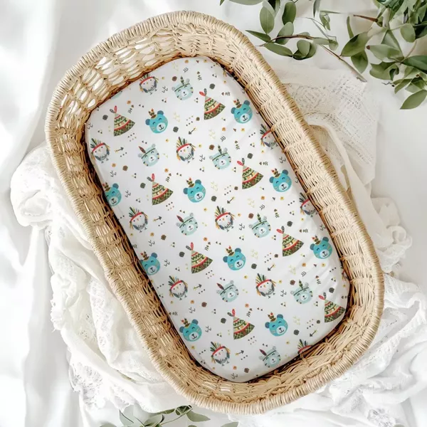 Σετ 2 σεντόνια λίκνου (ιδίου χρώματος) από ύφασμα φανέλα, 100% βαμβακερό, εμπριμέ, σχέδιο αρκουδάκια ινδιάνοι.Διατίθεται σε 3 χρώματα σε λευκό φόντο.
