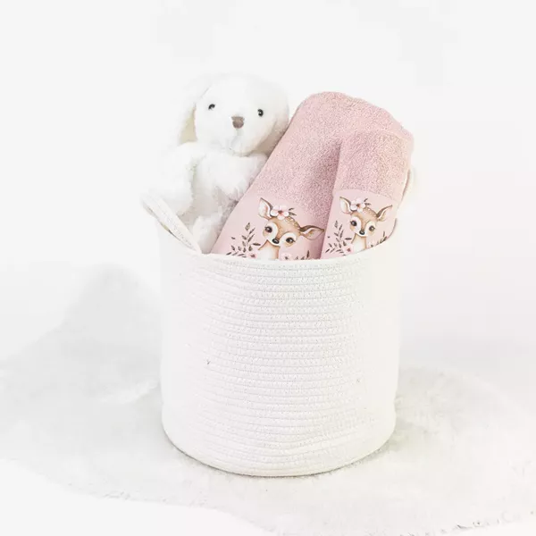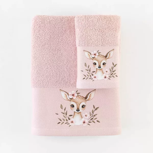 Σετ πετσέτες 2 τεμαχίων, μπάνιου και χειρός, από ύφασμα φροτέ πενιέ, 100% βαμβακερό, μονόχρωμο, πούδρα, με απλικέ, σχέδιο ελαφάκι.