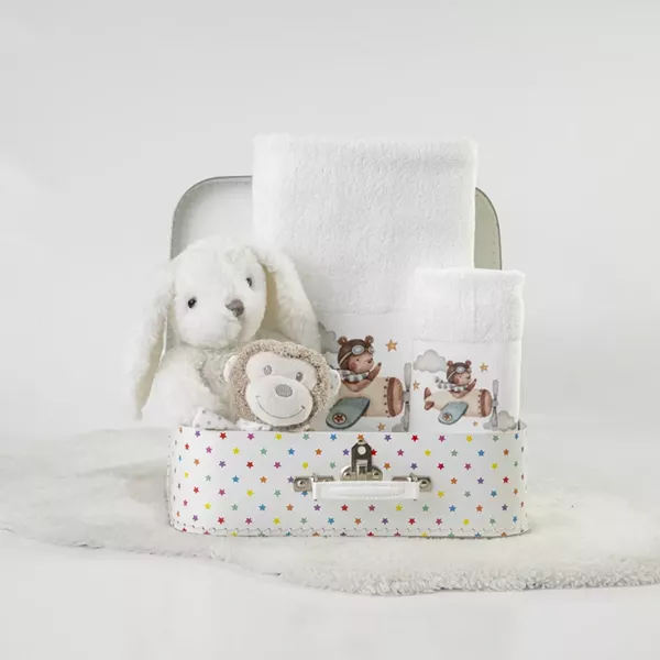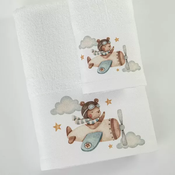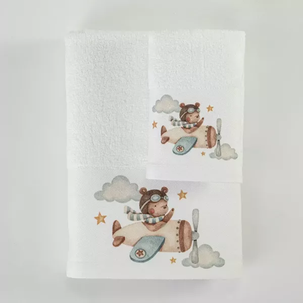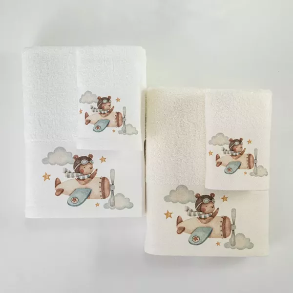 Σετ πετσέτες 2 τεμαχίων, μπάνιου και χειρός, από ύφασμα φροτέ πενιέ, 100% βαμβακερό, μονόχρωμο, εκρού, με ψηφιακή εκτύπωση, σχέδιο πιλότος.Διατίθεται σε 2 χρώματα.