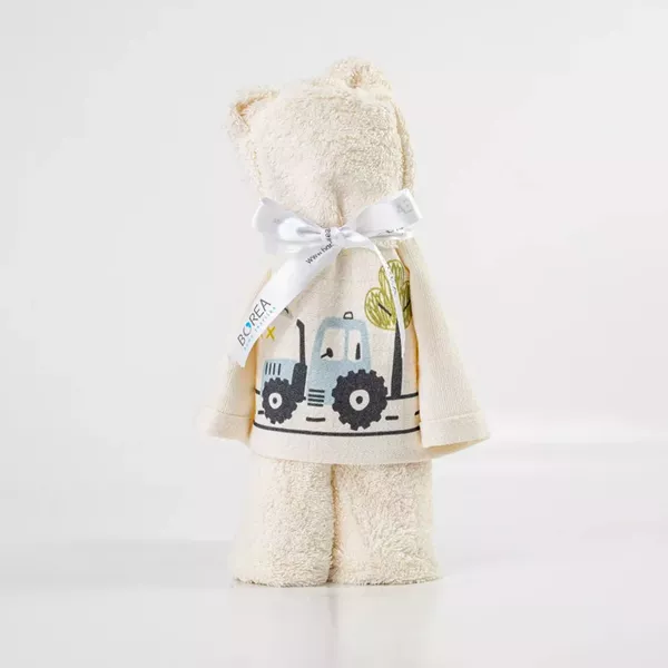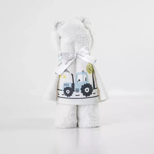 Πετσέτα προσώπου, από ύφασμα φροτέ πενιέ, 100% βαμβακερό, μονόχρωμο, με ψηφιακή εκτύπωση, σχέδιο τρακτέρ, σε συσκευασία/σχήμα αρκουδάκι.Διατίθεται σε 2 χρώματα.