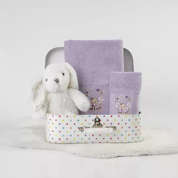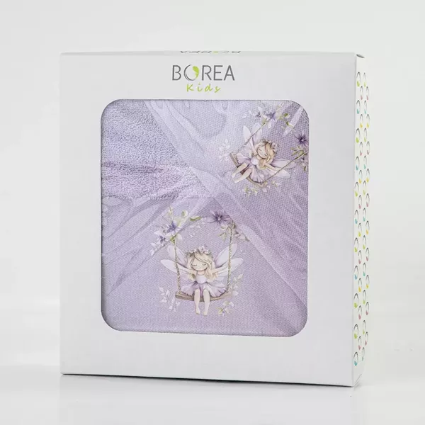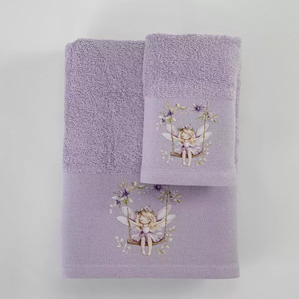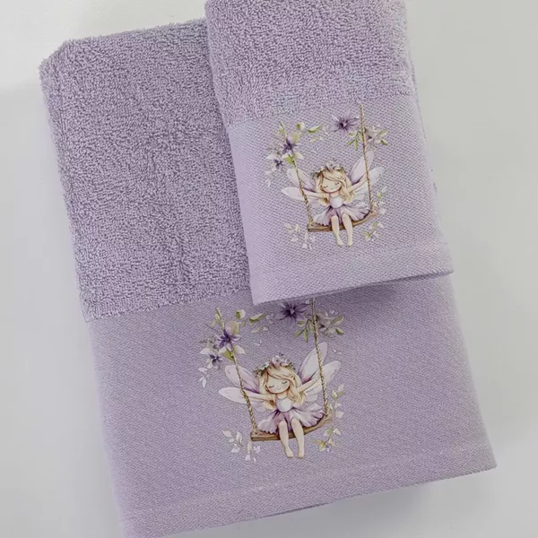 Σετ πετσέτες 2 τεμαχίων, μπάνιου και χειρός, από ύφασμα φροτέ πενιέ, 100% βαμβακερό, μονόχρωμο, λιλά, με απλικέ, σχέδιο νεράιδα σε κούνια.