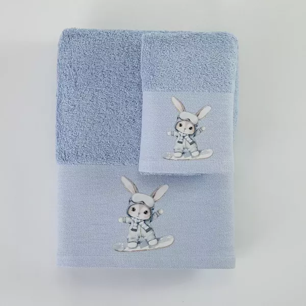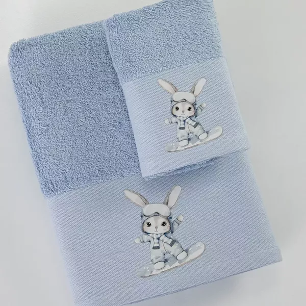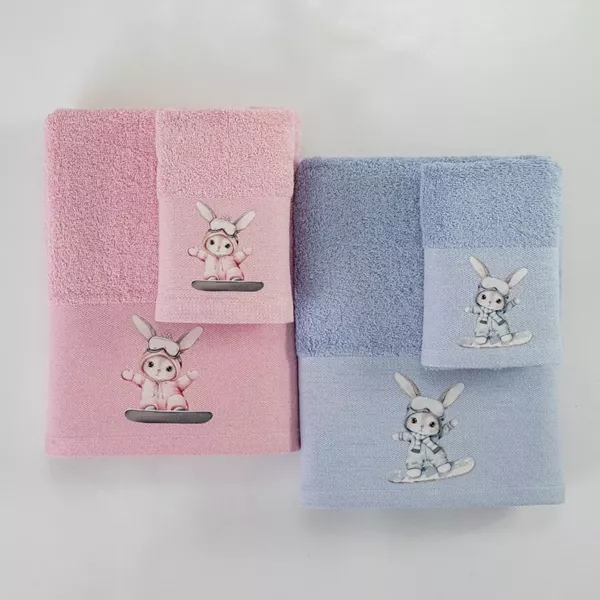 Σετ πετσέτες 2 τεμαχίων, μπάνιου και χειρός, από ύφασμα φροτέ πενιέ, 100% βαμβακερό, μονόχρωμο, ροζ, με απλικέ, σχέδιο λαγουδάκι σε snowboard. Διατίθεται σε 2 χρώματα.