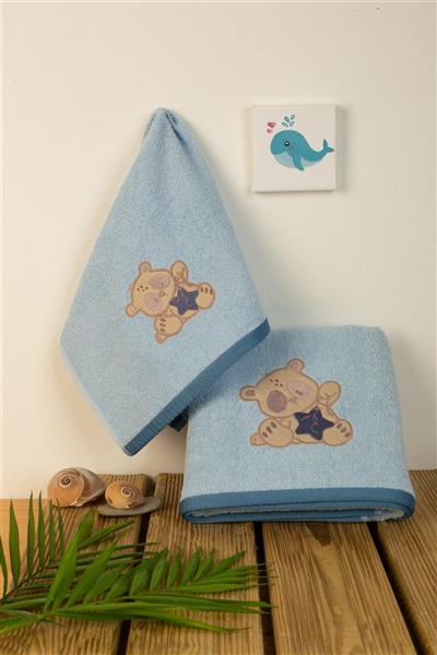 Σετ βρεφικές πετσέτες μπάνιου που περιέχει : 1 τεμάχιο πετσέτα χειρός διαστάσεων 30X50 cm και 1 τεμάχιο πετσέτα μπάνιου διαστάσεων 70X140 cm.Οι πετσέτες έχουν χρωματιστή υφασμάτινη φάσα και σχέδιο με κέντημα και είναι κατασκευασμένες από 100% βαμβάκερη πετσέτα 400 gsm, υψηλής απορροφητικότητας. Συσκευασία Δώρου Κουτί Πολυτελείας.