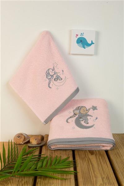 Σετ βρεφικές πετσέτες μπάνιου που περιέχει : 1 τεμάχιο πετσέτα χειρός διαστάσεων 30X50 cm και 1 τεμάχιο πετσέτα μπάνιου διαστάσεων 70X140 cm.Οι πετσέτες έχουν χρωματιστή υφασμάτινη φάσα και σχέδιο με κέντημα και είναι κατασκευασμένες από 100% βαμβάκερη πετσέτα 400 gsm, υψηλής απορροφητικότητας. Συσκευασία Δώρου Κουτί Πολυτελείας.