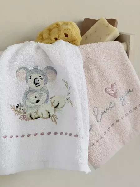 Τα βρεφικά πετσετάκια koala love έχουν ροζ και λευκό χρώμα και είναι διακοσμημένα με όμορφα κεντητά μοτίβα. Τολευκό έχει ένα χαριτωμένο κοάλα, ενώ το ροζ έχει κεντημένη την τρυφερή φράση ilove you, με μια καρδούλα. Είναι ένα υπέροχο καλαίσθητο σετ με πετσετάκια που θα σας γίνει απαραίτητο σε κάθε σας βήμα μέσα και έξω από το σπίτι. Ιδανικό για να το χαρίσετε σαν δωράκι στους νέους γονείς που μόλις υποδέχθηκαν το μωράκι τους.