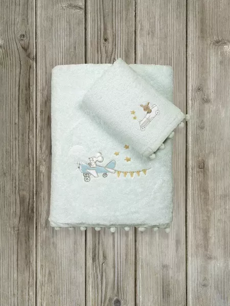 Οι βρεφικές πετσέτες joy ride ζωντανεύουν με ένα γλυκό και παιχνιδιάρικο κεντητό σχέδιο που απεικονίζει ένα χαριτωμένο ποντικάκι να πετά με το αεροπλανάκι του. Μια σειρά από διακοσμητικά σημαιάκια και χρυσαφένιους αστερισμούς προσθέτουν μια νότα χαράς και φαντασίας, ενώ μικρά, αφράτα σύννεφα συμπληρώνουν το ονειρικό σκηνικό. Το βασικό χρώμα της πετσέτας είναι ένα γαλήνιο τιτκουάζ χρώμα, που δημιουργεί μια ήρεμη και χαλαρωτική ατμόσφαιρα. Τα παιχνιδιάρικα πομ πομ στο τελείωμα προσδίδουν μια έξτρα χαριτωμένη πινελιά. Με μοναδική απαλή αίσθηση και αντοχή, εξασφαλίζουν την καλύτερη εμπειρία για το μπάνιο του μωρού σας.