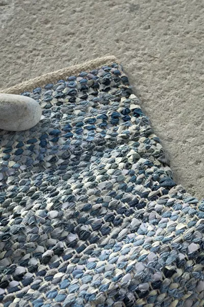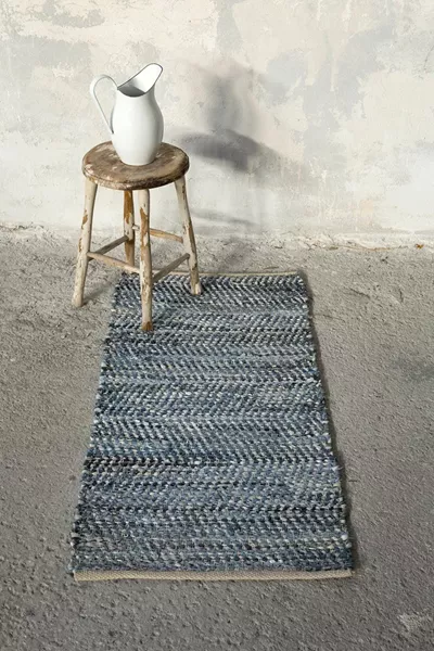 Χαλί χειροποίητο από 50% denim και 50% δέρμα. Ένα χαλί που έρχεται στο σπίτι για να μείνει για πάντα. Χάρη στη σύνθεση του είναι από τα πιο ανθεκτικά που μπορείτε να επιλέξετε. Έχει χαμηλό πέλος και είναι ιδανικό για πολυσύχναστα δωμάτια και περάσματα μιας και έχει υψηλή αντοχή στη συχνή, καθημερινή χρήση όλο το χρόνο.
