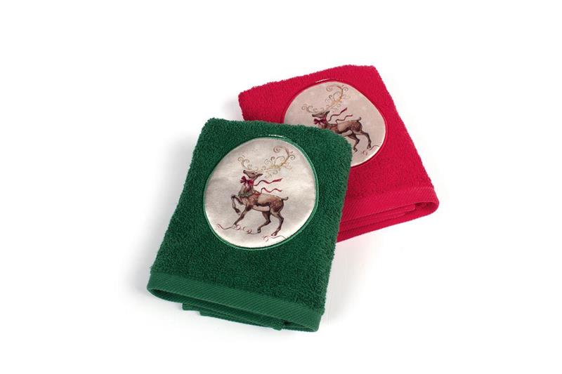 Σετ πετσέτες Χριστουγεννιάτικες 2 τεμ. με applique με χαρούμενα γιορτινά σχέδια και ανεξίτηλα χρώματα, ιδανικό για δώρο που περιέχει που περιέχει: 2 πετσέτες χειρός διαστάσεων 40X60, μία σε κόκκινο και μία σε πράσινο χρώμα. Οι πετσέτες είναι κατασκευασμένες από 100% βαμβάκι έξτρα απαλό και απορροφητικό. Συσκευασία δώρου με γιορτινή κορδέλα.