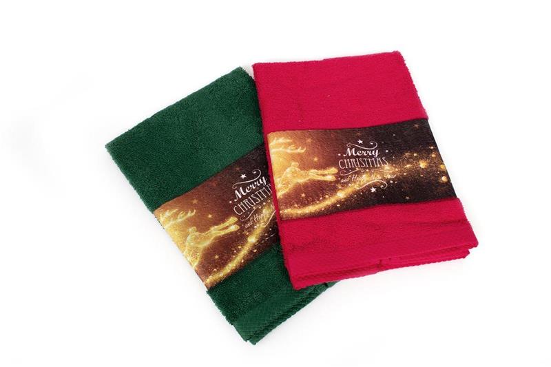 Σετ πετσέτες Χριστουγεννιάτικες 2 τεμ. με ανεξίτηλα χρώματα και σχέδιο με φάσα ψηφιακής εκτύπωσης που απεικονίζει γιορτινούς τάρανδους και μήνυμα για καλά Χριστούγεννα, ιδανικό για δώρο που περιέχει που περιέχει: 2 πετσέτες χειρός, διαστάσεων 40X60, μία σε κόκκινο και μία σε πράσινο χρώμα. Οι πετσέτες είναι κατασκευασμένες από 100% βαμβάκι έξτρα απαλό και απορροφητικό και είναι ελεγμένες για επιβλαβείς ουσίες με το αναγνωρισμένο παγκοσμίως πιστοποιητικό, OEKO TEX® Standard 100. Συσκευασία δώρου με γιορτινή κορδέλα.